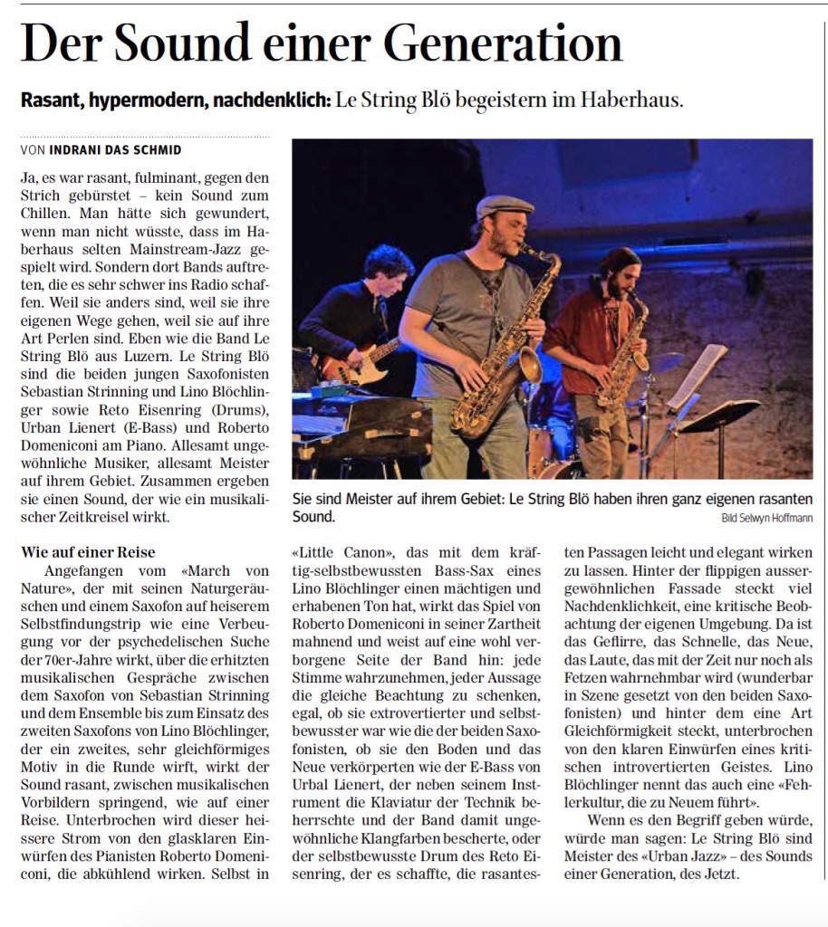 ...bringen die rüttelnde Power der jungen Garde mit der Erfahrung von Musikern zusammen, die schon länger die Szene aufmischen. Gemeinsam kreieren sie eine Musik, die von Freiheit und Energie befeuert wird. Die Interaktionen sind dicht und heftig, gleichzeitig ist eine Übersicht am Werk, die den Musikstrom selektioniert und den Sound konzentriert hält. Die Stücke stammen von den beiden in Luzern arbeitenden Bläsern Sebastian Strinning und Lino Blöchlinger. Sie gehören zu den vielseitig präsenten Köpfen der jungen Schweizer Jazzgeneration.