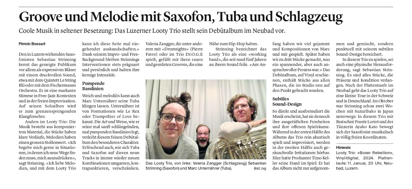 Das Looty Trio möchte spielen, aber nicht nur. Maulkörbe gibt es keine, von Leinen losgerissen wildern wir uns selber aus. Nicht nur Waden sind gefährdet, wir zielen gerne auch höher. Dabei plündern und schärfen wir unsere über Jahrzehnte angesammelten Werkzeuge: Vom Jazz-Skalpell bis zum Punk-Dampfhammer benutzen wir alles, was uns zwischen die Lefzen gerät, um Ketten sprengen und gegen protzige Paläste, entwürdigende Systeme und - nicht zuletzt - langweilige Musik anzubellen.